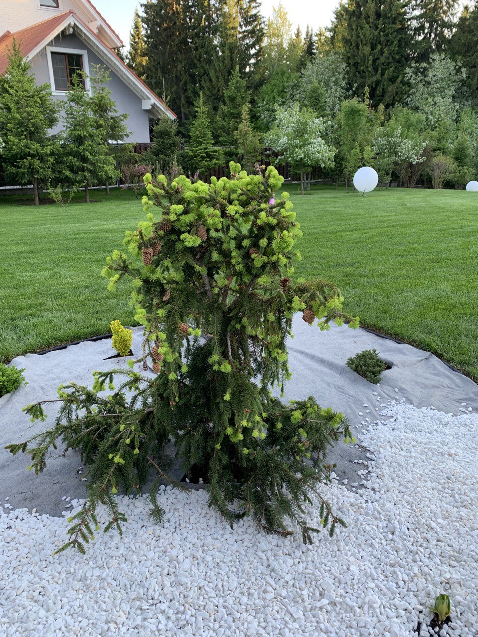 Начало июня. Плановые работы по завершению большой реконструкции позапрошлогоднего объекта в Протасах. Закладка рокария с центральной фигурой - елью Акрокона. Снятие газонного покрытия, формирование рокария в тон с остальными в белой мраморной крошке.