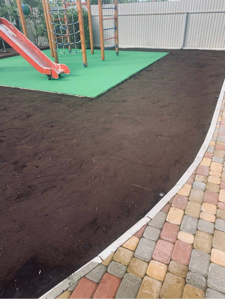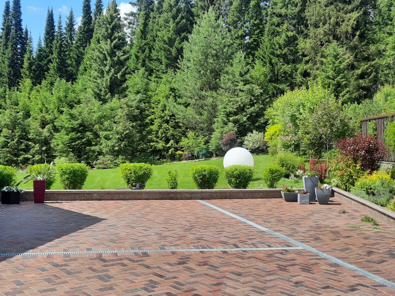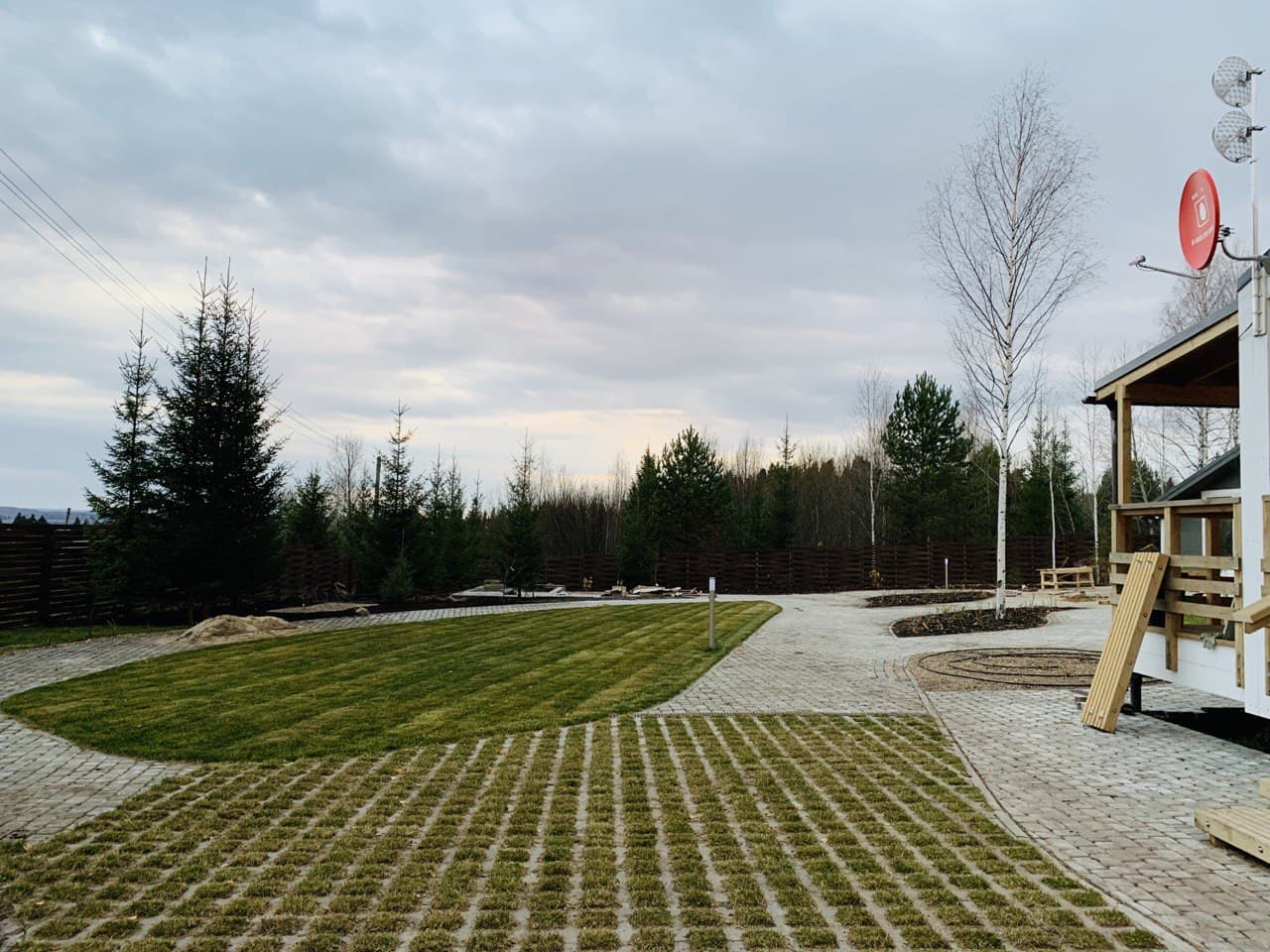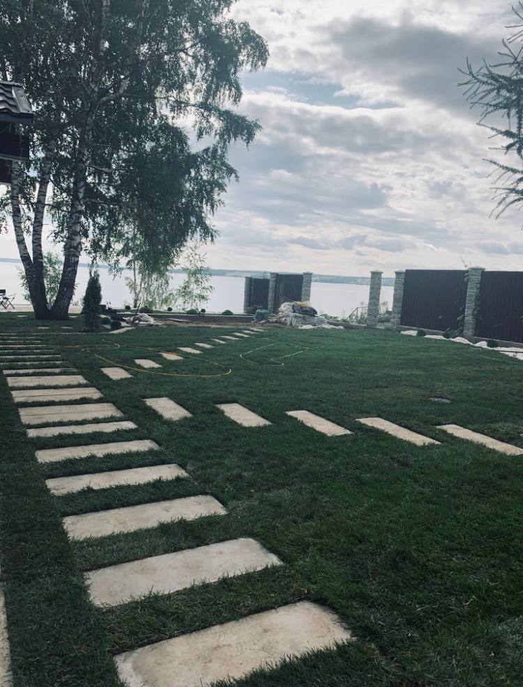 На объекте был приличный перепад высот, но в итоге он почти незаметен. Сделана разуклонка дорожек, водоотведение, даже отростки были сделаны по разным высотам.