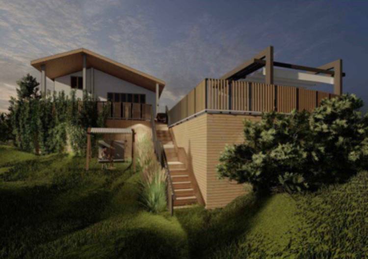 Было задействовано почти 20 специалистов. Изменено свайное поле террасы и лестницы. К зиме была закончена обшивка террасы обработанной лиственницей, выполнены перила на каскаде и балконе. Сварена и установлена лестница. Работы продолжатся в 2022 году.