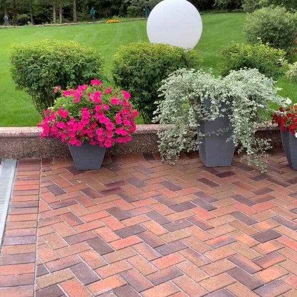 Была выбрана плитка полукруглой формы Классико в эффектном цвете Листопад, позволяющая играть с поверхностью. Освещение подобрано в стиль внутреннего оформления дома. Есть маленькая площадка для игр, плодовый сад, много декоративных клумб в желто-оранжевом цвете в зоне открытой террасы дома.