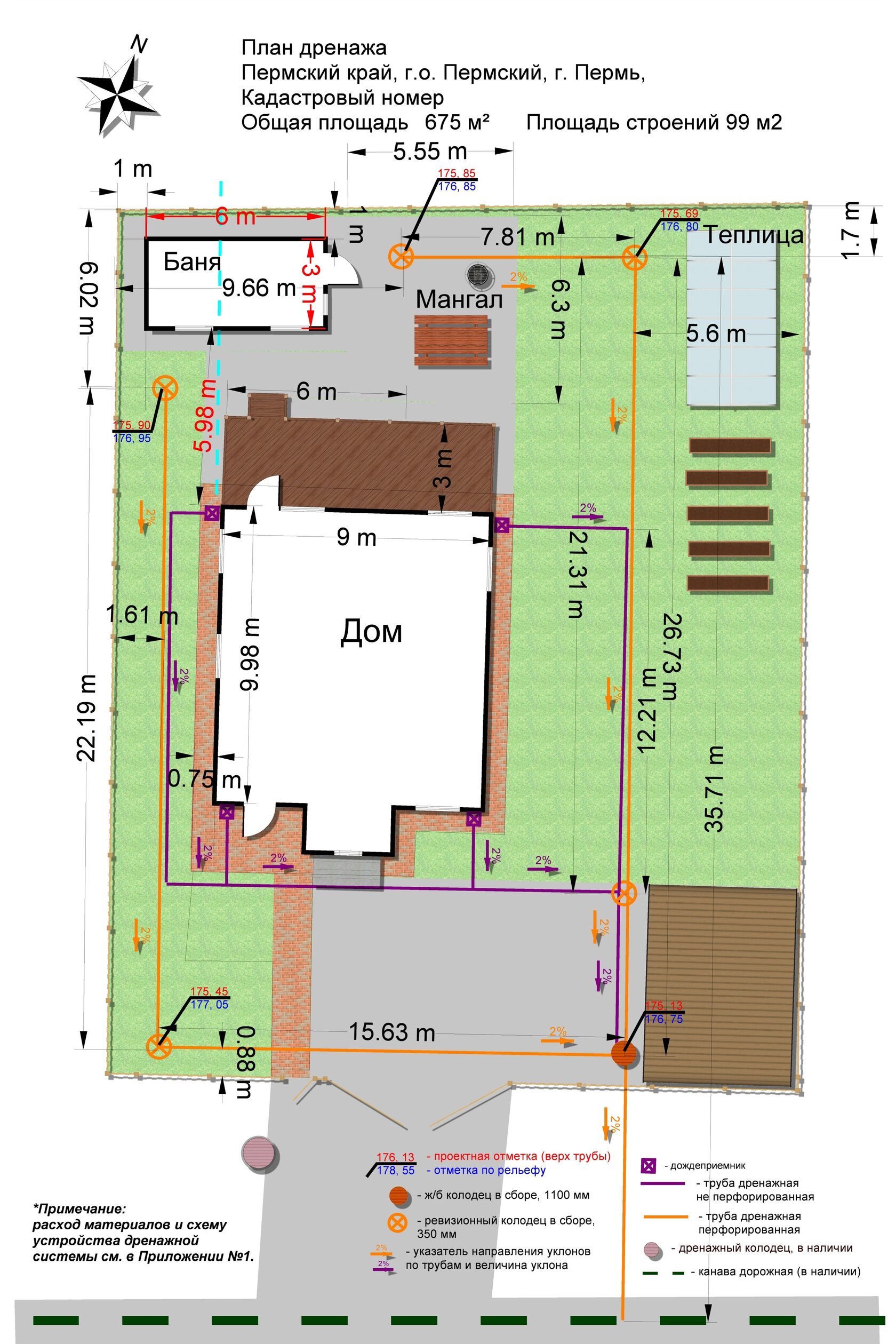 План ливневой канализации и дренажной системы - чертеж в соответствии с ГОСТ, с вертикальными отметками и обозначением конструктивных элементов и узлов, ведомостью материалов