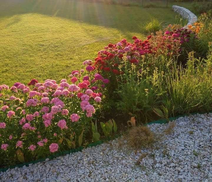 Клумбы у входа в беседку по цветовой гамме повторяют общее наполнение цветников на участке. Сама беседка окружена сиренями, запах которых наполняет сад весной.