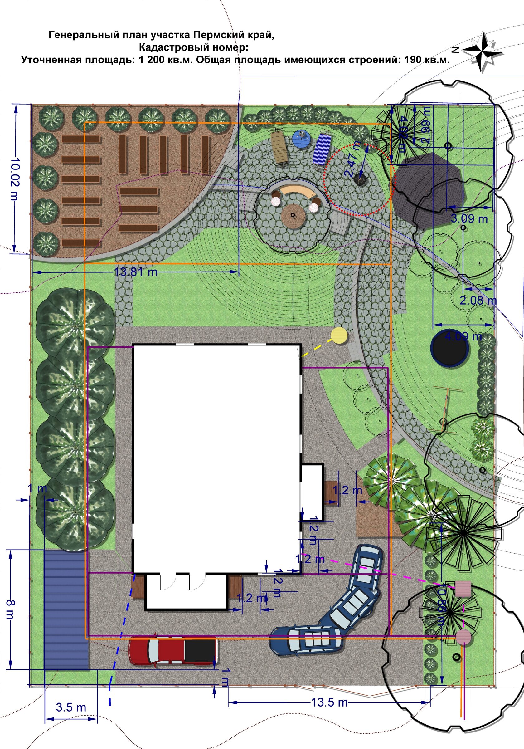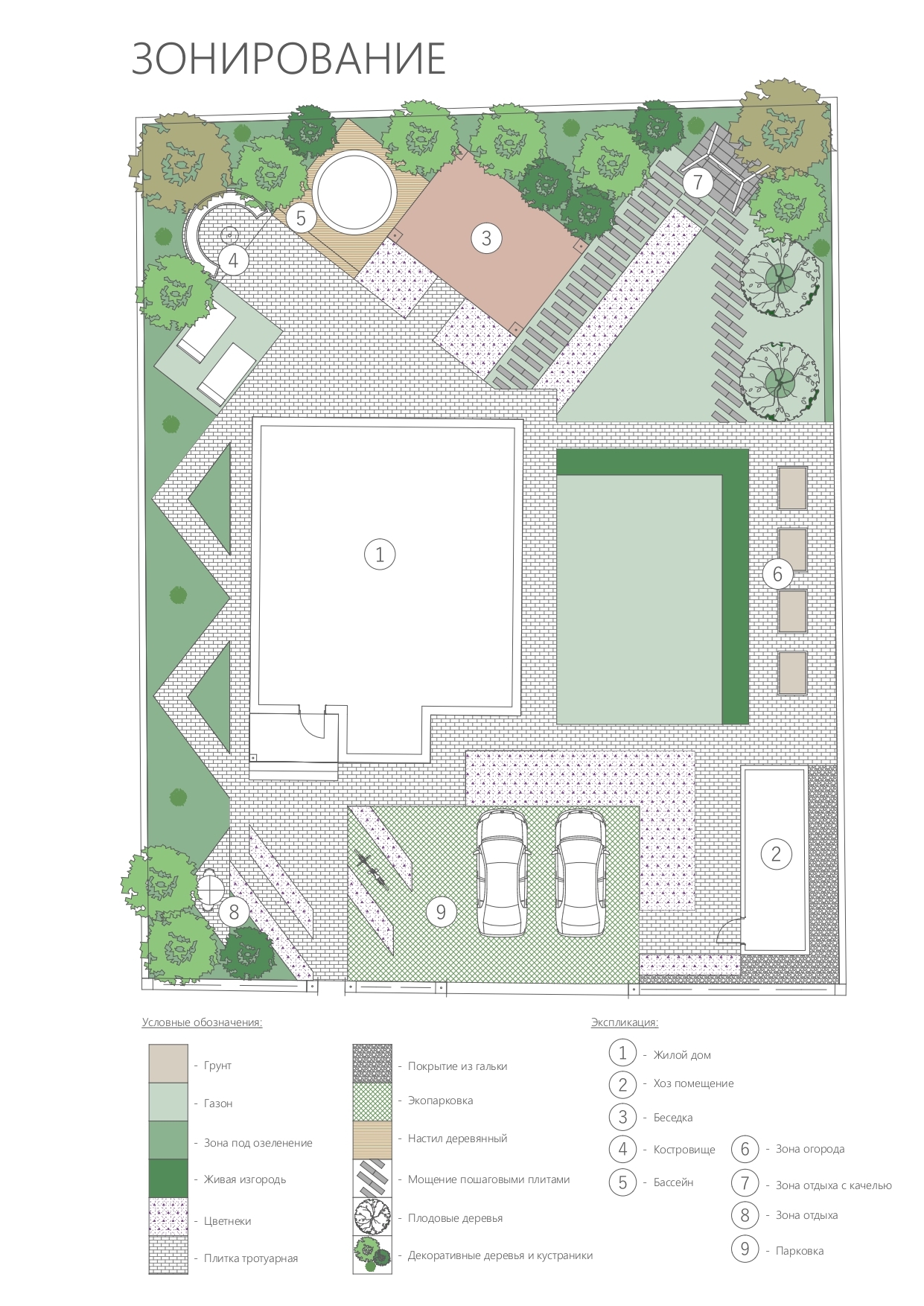 Дано: загородный дом на участке 6 соток. Необходимо разместить парковку, беседку, места отдыха, мангальную зону или костровище, качели, наполнить сад запахами.