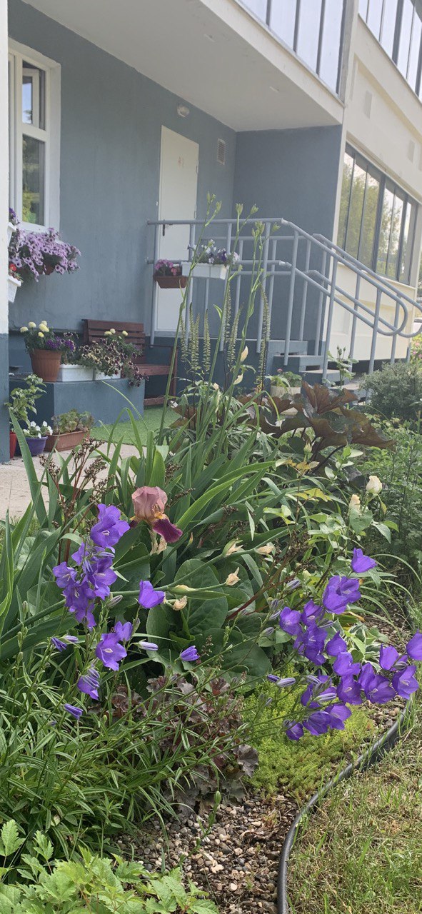 Из центрального входа можно выйти и расположиться за чашкой кофе на солнечной стороне за столиком под кустами сирени, среди клумб из пряного шалфея Швеленнбург, разбавленного воздушной сислерией и брунерой, сменяющегося осенью монардой эффектного красного цвета.